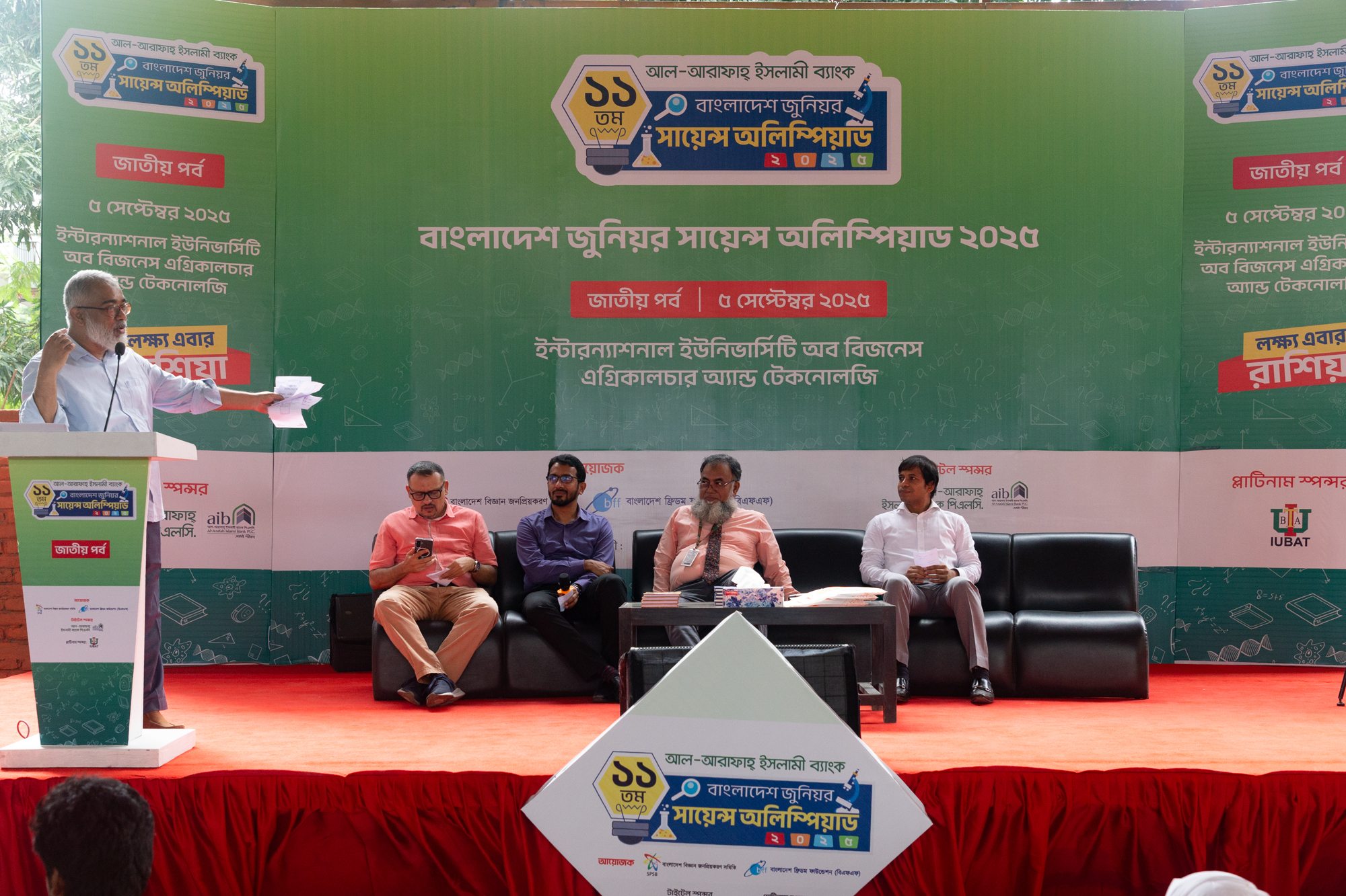 বিজ্ঞানচর্চার সবচেয়ে বড় মঞ্চ আল-আরাফাহ্ ইসলামী ব্যাংক ১১তম বাংলাদেশ জুনিয়র সায়েন্স অলিম্পিয়াড ২০২৫ আজ (৫ সেপ্টেম্বর ২০২৫) অনুষ্ঠিত হয়েছে। সকাল ৭টা থেকে IUBAT ক্যাম্পাস মুখরিত হয় বাংলাদেশ জুনিয়র সায়েন্স অলিম্পিয়াড ২০২৫ এর জাতীয় পর্বে সারাদেশের নানান প্রান্ত থেকে আগত অংশগ্রহণকারীদের পদাচরণায়।